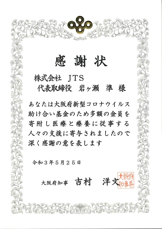 大阪府新型コロナウイルス助け合い基金に寄附 投稿日 2021年5月21日 更新日 2026年4月7日 著者 jts-kunida カテゴリー ニュース 2021年5月25日、 大阪府新型コロナウイルス助け合い基金に寄附いたしました。